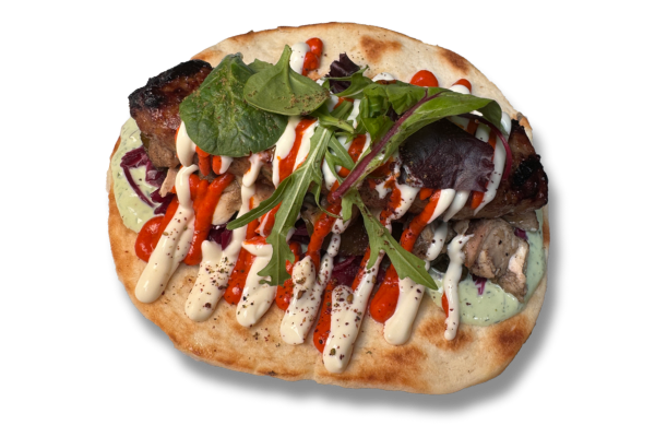 Free range chicken shish with southern fried crispy chicken skin, herb yogurt, pickled red cabbage, cucumber & celery salsa, sweet chilli mayo and coriander.