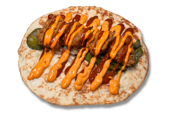 Crispy-fried chicken with pickled cucumbers & red onions, sweet chilli mayo and BBQ sauce.